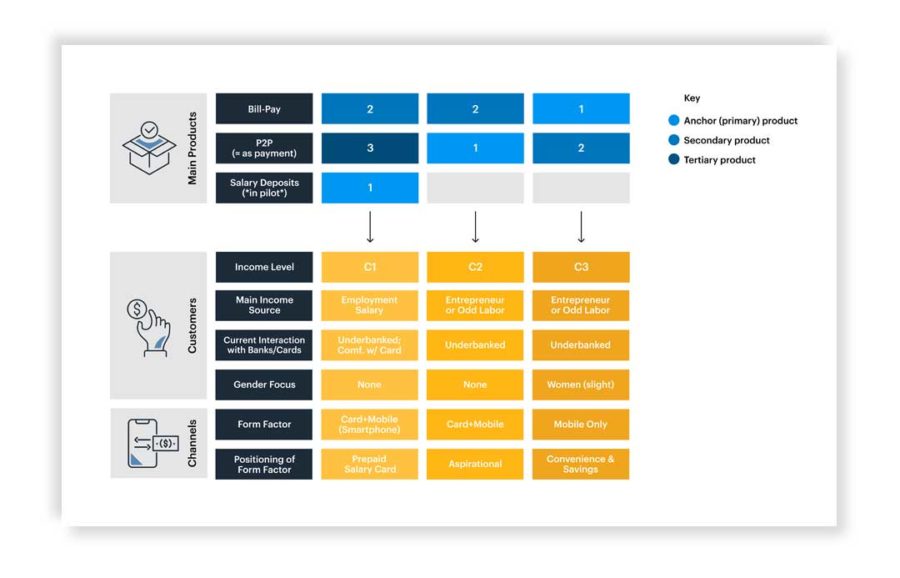 It became clear that the fintech partner was treating the low-income segment as a single, uniform market. Digital Disruptions proposed a three-vector approach to offer the right product, to the right customer, through the right channels, known as “channel-product-customer” segmentation. The results helped the organization focus its efforts on those customers segments which would most likely adopt its products and provide a sizeable source of recurring revenue.