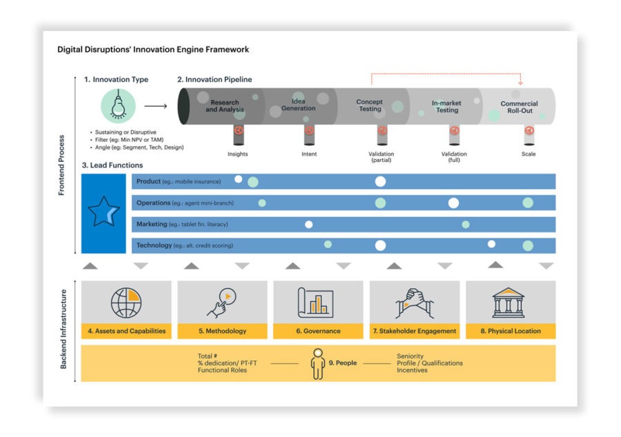We then used our Innovation Engine framework to design a Design Lab suited for the bank’s needs. The framework is comprised of nine key building blocks, including type of innovation, functional area, assets and capabilities, and governance.